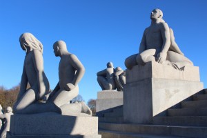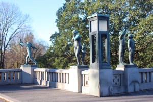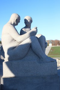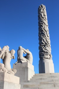 So ticket in hand off we set to find the tram out to the Vigeland Sculpture Park. This is one of Oslo’s most popular places which shows the life work of Gustav Vigeland. There are more than 200 bronze, granite, and iron sculptures laid out over hectares of parkland – also designed by Vigeland. The sculptures of human form seem to be depicting human relationships of all varieties. Not just the relationships themselves of say, parent and child, but many of the different aspects. So as an example there are statues showing a mother holding a baby, then another piggybacking her two children around many examples of different interactions between siblings, parents, grandparents, couples etc. The figures are all without clothing to differentiate class or style or to judge in any other way. They are simply people interacting with one another.