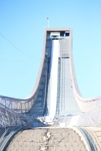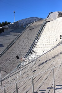 From the park we headed back by tram to the station Majorstuen where we caught the train up to Holmenkollen. The train took us through the suburbs which are picturesque at each turn. Holmenkollen is where we find the ski jump that has been part of the Oslo landscape since 1866…not quite as it is today, however there has been a ski jump on this site since then. It has been transformed and upgraded over the centuries and has featured in Olympic and World Championships. Since my first visit to Oslo in 1992, it has been expanded and improved twice. Each improvement gives more technical scope for the athletes to achieve further distance with their jumps. Quite honestly, just climbing the stairs of the spectators area gave me vertigo, let alone hurtling down it on two planks of highly technical equipment. The arena and jump itself are quite impressive feats of engineering and I’m glad we made the trip out to see it. There’s no snow at the moment so there was no action to see unfortunately.
