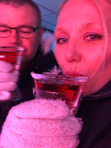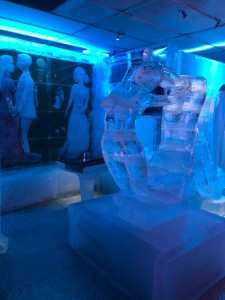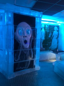 After dinner we went to the Ice Bar. This is a bar which as the name suggest, is made entirely of ice. The bar, the seats, the tables, the walls even the drinks are serviced in ice glasses. We just had to experience it. Each season the bar is created featuring sculptures and art from a particular artist. On our visit it was a Norwegian artist called Munch. There is a museum in Oslo dedicated to his work. We won’t have time to visit the real museum, but at least got a feel for his work as it was represented in ice.