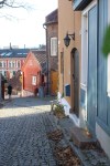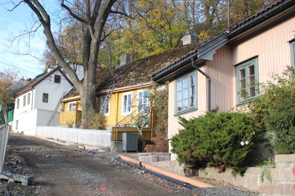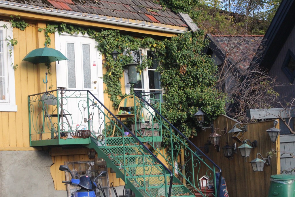 We had been told about a couple of streets that had some typical, traditional Oslo homes. They were near here so we left the river behind for a while and explored the surrounding streets. Andy navigated us to Telthusbakken first. The traditional houses are timber clad and painted in bright colours. Yellow, pink, blue, maroon, with white trimming. Directly opposite in this street were allotment style gardens, planted with veggies, herbs, flowers and each with a seating space some with obvious design and others with simple chair and table.