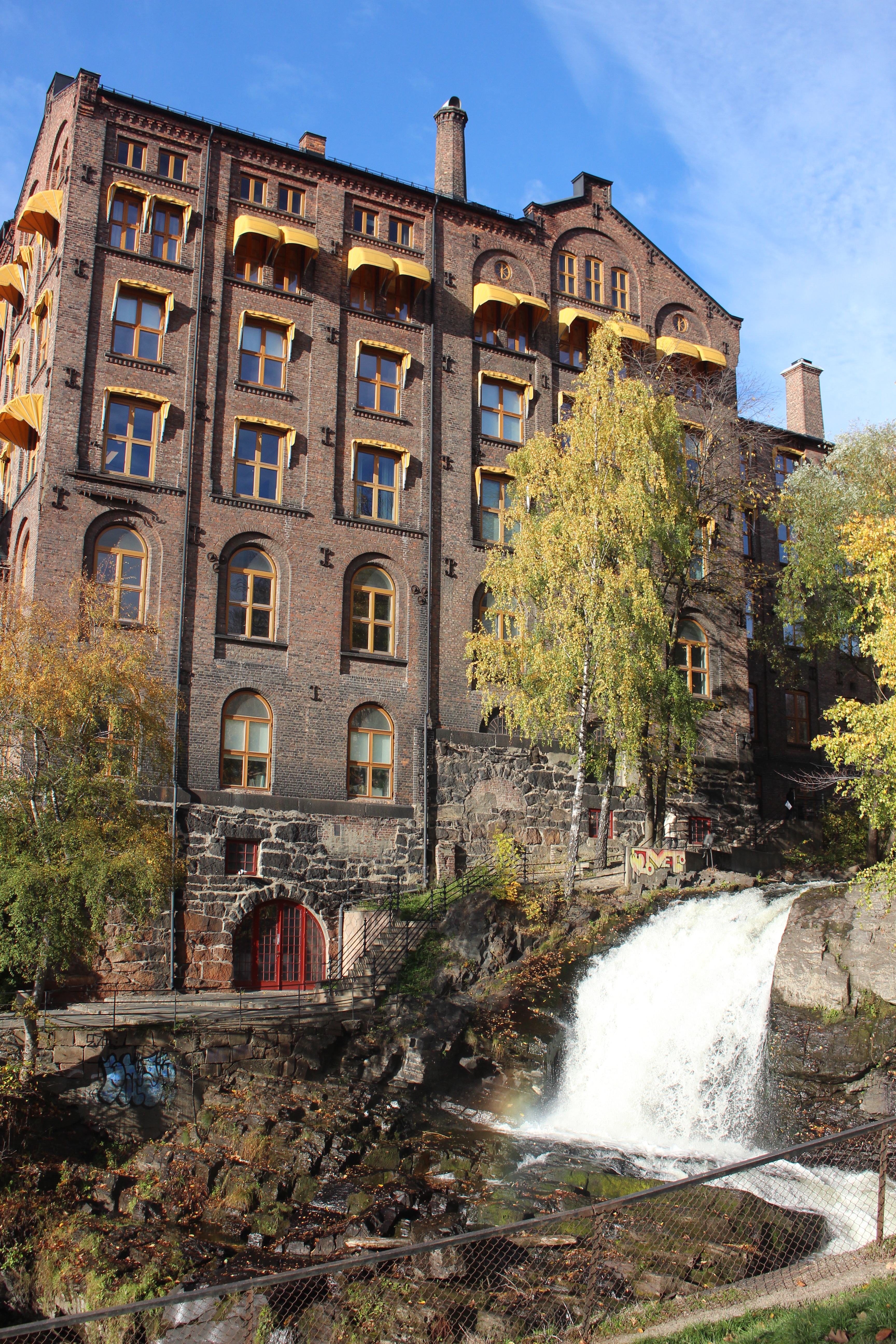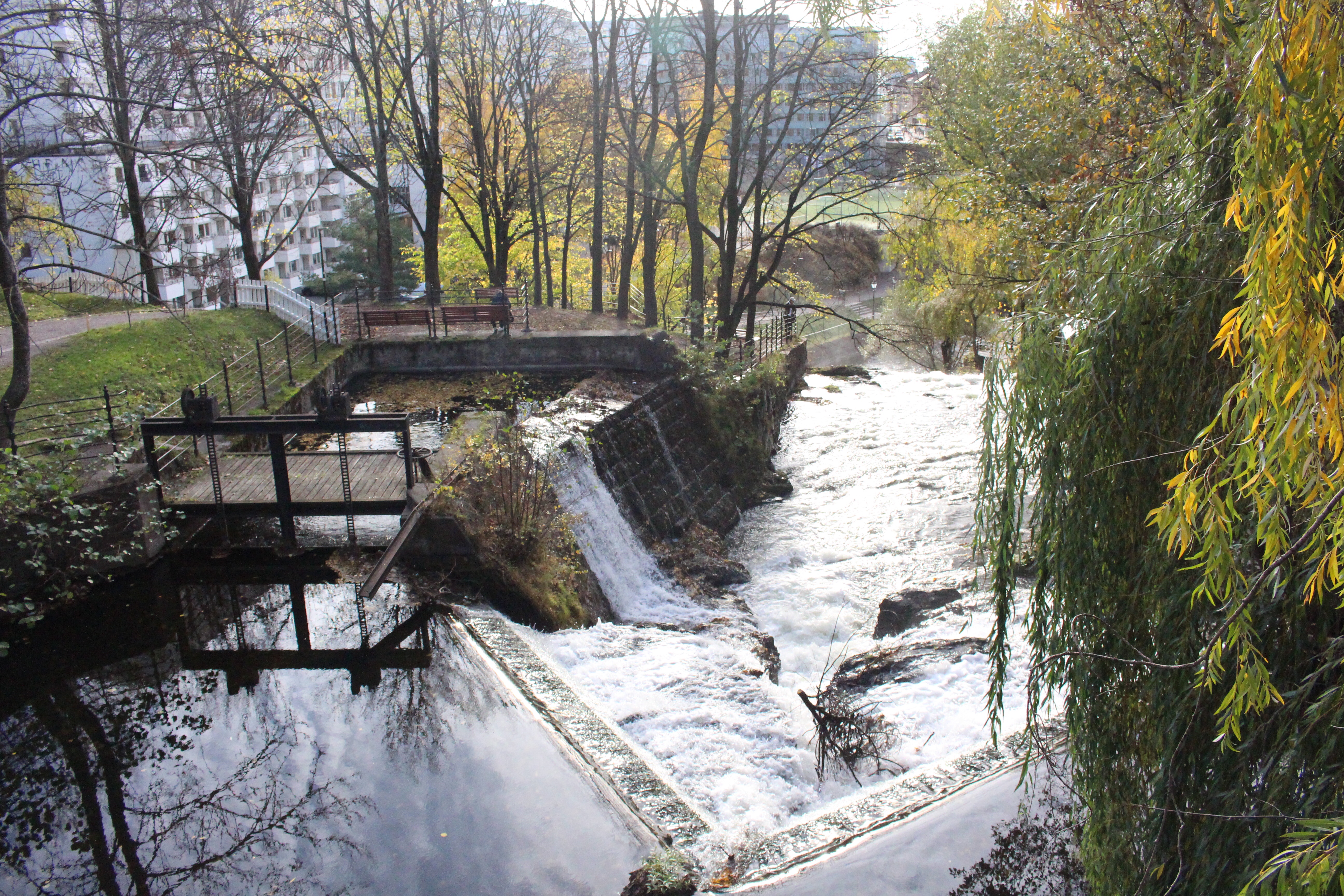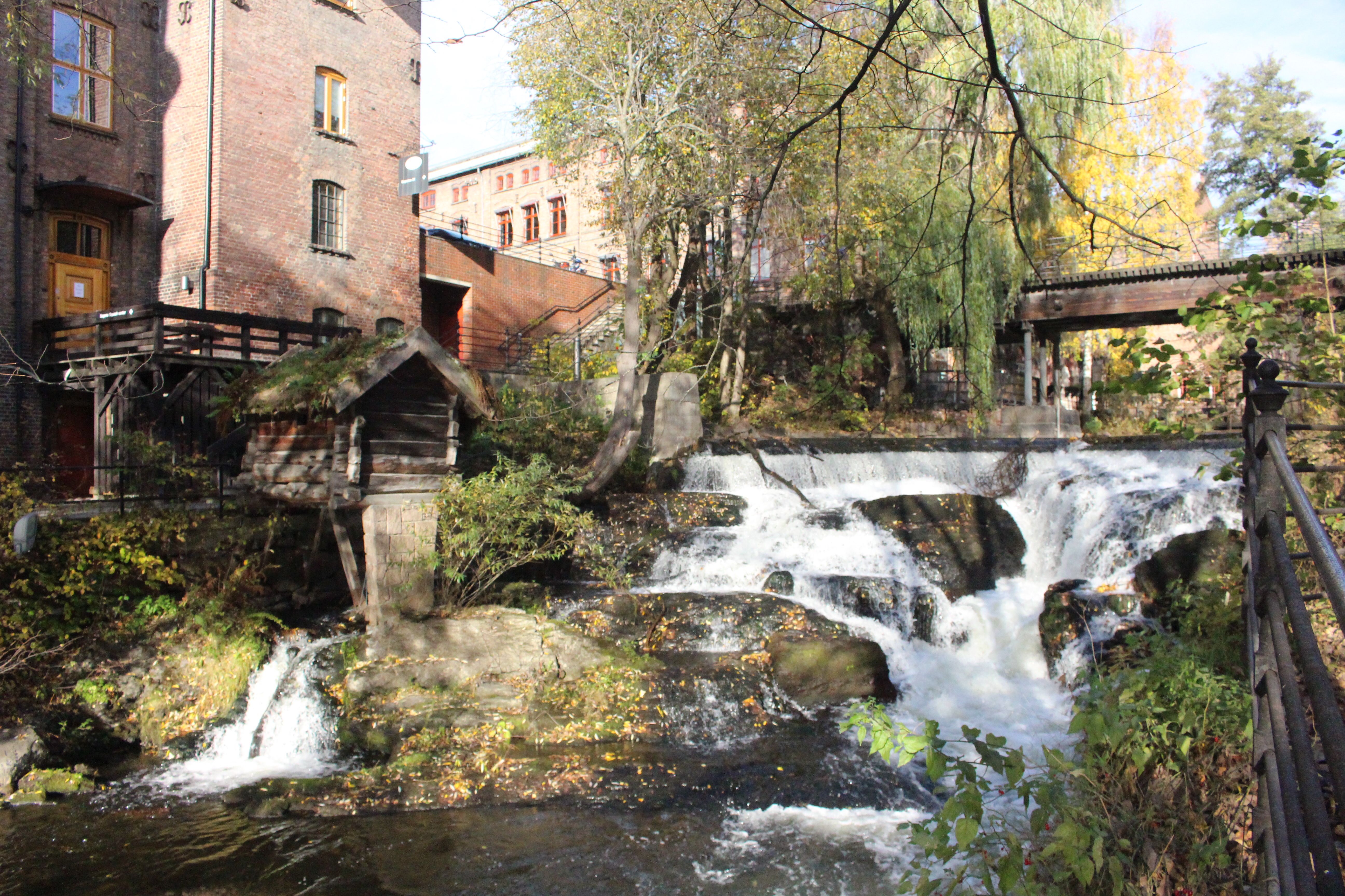 Onward towards the waterfalls. We passed a few spots where the water tumbled down rocks creating photo ops among the old buildings, ornate bridges and surrounding autumn landscape. Eventually we reached the edge of the map and enjoyed the view and sound of the water. The main waterfall tumbles right next to buildings, paths, gardens and a cafe. It was a short walk from here out to the main busy streets where we caught a bus back to the city. From the main streets around Alexander Kieliands Plass you wouldn’t know that the natural waterfall at Molla was hiding just behind the buildings and apartments.