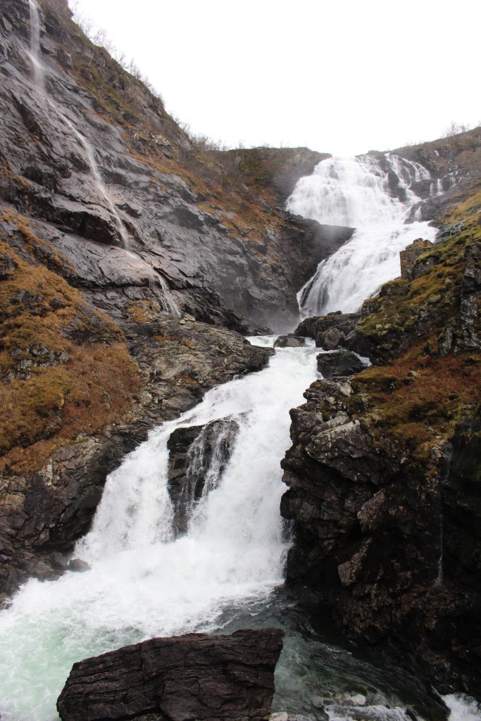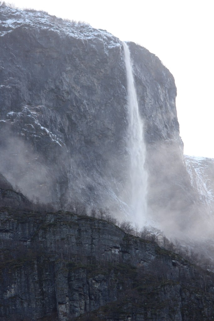 The views needless to say were incredible. Winding through the steep gorge and with views back across the valley below. As we climbed we returned to the snow line which just added to the magic. At one point the train stopped at the Fjosfossen Waterfall where we were able to get out and take in the view and photograph the falls.
