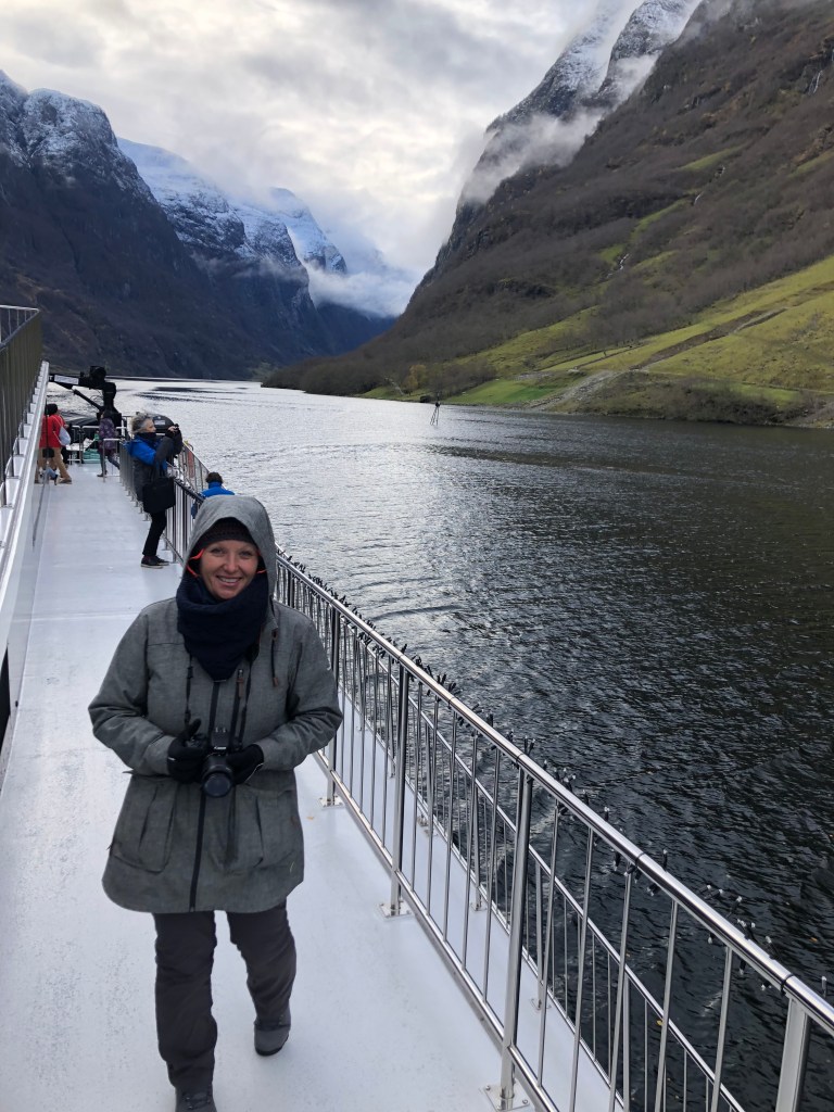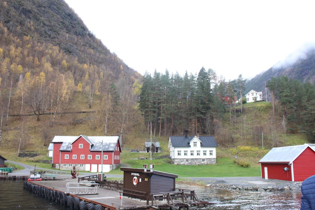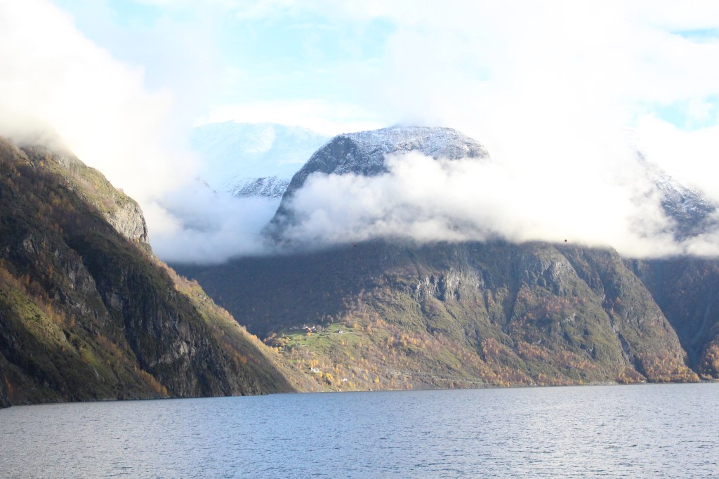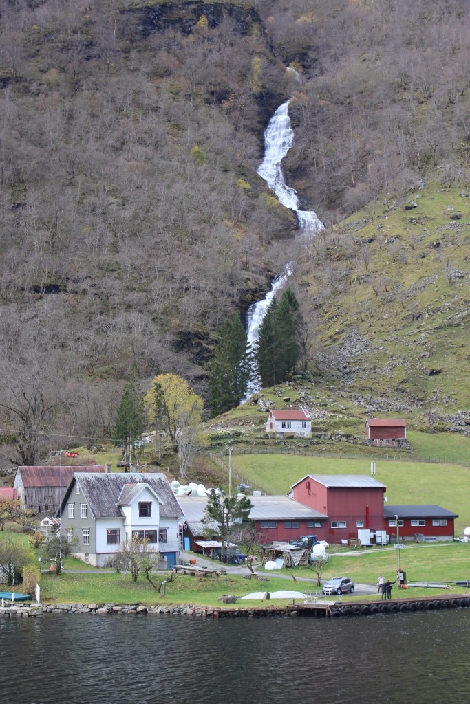 As we set off down the Naeroy Fjord flanked by immense cliffs and the dramatic sheer rock falls. Along the the way on the foot hills of the cliffs were remote groups of the coloured homes. These isolated little communities are occupied by farmers and more popular in the summer as destinations for kayakers and holiday makers.