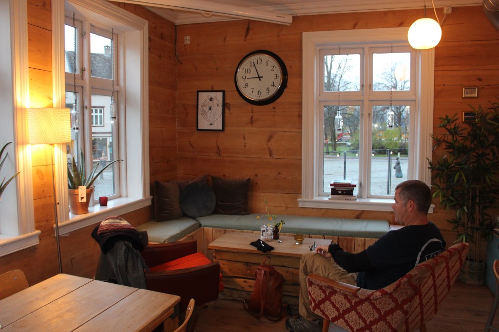 After breakfast we strolled into Voss for a coffee before boarding our coach for the day tour around the mountains. We found the best cafe so far, Tre Bror Kafe. The young lady opened up for us, made a perfect flat white and cappuccino. We sat by picture windows in comfy armchairs and as chatted about life in Norway and Voss.