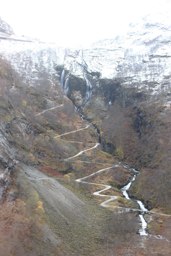 Along the road we came to section of tunnels for 4.2km. There was a short break between tunnels, where we could see a glimpse of long narrow and steep gorge. Once through the tunnels though the road was following close to the river as it cut its way between the steep cliffs. Towering high above there are some fir trees and again the silver birch hanging desperately to their last golden leaves. The green in this landscape comes from bright thick moss that clings to the rocks. High up on the cliffs are strings of water falling towards the valley below. Behind the immediate cliff face were taller snow covered peaks showing through the clouds.