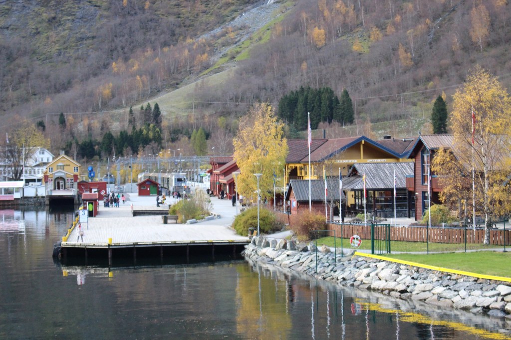 We are approaching the wharf at Flam. What a gorgeous, vibrant township! The Flam railway leaves from here to zig-zag up 980m above sea level to Myrdal. We passed through Myrdal yesterday and from here we will connect with a local train to complete our tour back in Voss.