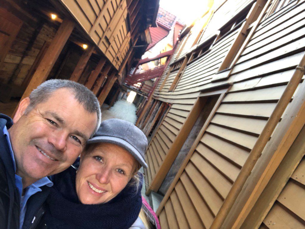 After our pit stop we headed down to the area known as Bryggen. Bryggen was established around 1070, around the Viking era, and is now a World Heritage site. The current buildings date back to the Hanseatic (German Merchant) era. Bergen was the original capital of Norway and this area in particular was a trading centre with commercial warehouses, taverns and shops. You can read detail of the history at the Unesco website . A couple of the buildings are currently undergoing restoration. The outside is draped in a canvas that has the original building image printed on the outside so as to preserve the aesthetic of the landscape as best as possible. Through some windows we could see the restoration being made on top of the original foundations.