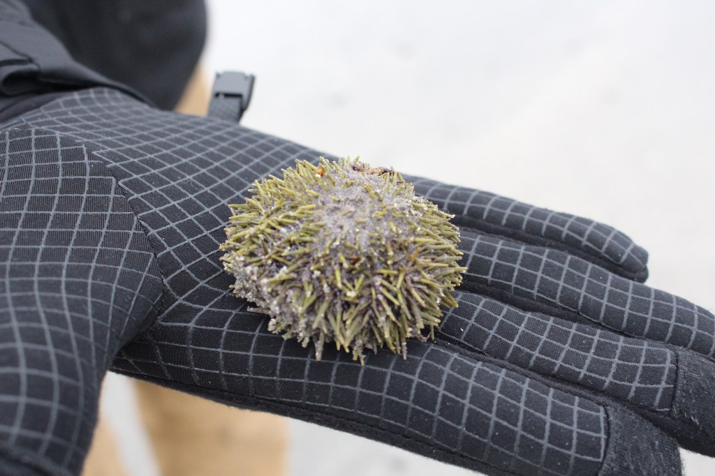 Our walk took us onto the beach. Were were surprised to learn that there is coral local to these areas. The coral is white and needs cold water. It grows between 100-400 metres under the water and is crucial for sheltering spawning fish. We also found a strange looking jellyfish. Most unusual though was probably seeing ice on the beach!