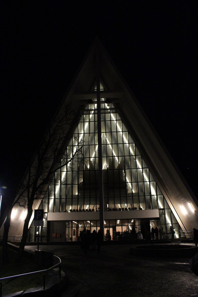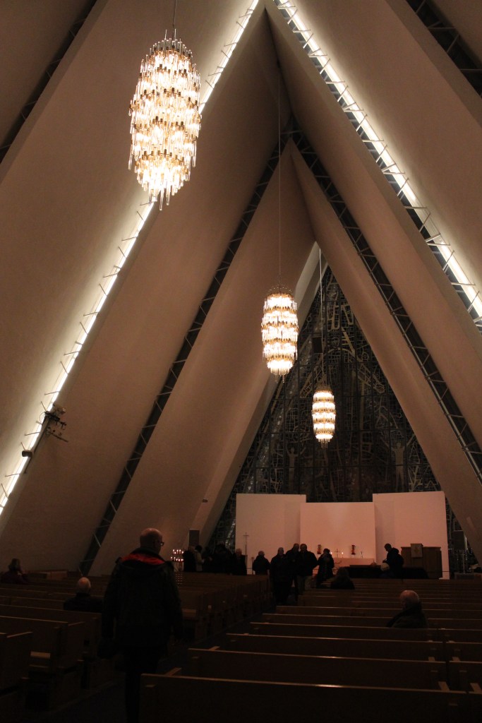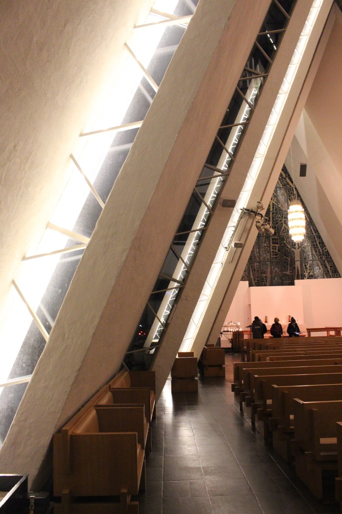 Our second stop was the ‘Arctic Cathedral’. It was completed in 1965, so is a modern addition to the landscape. It features a large stained glass window that depicts Christ flanked by Adam and Eve. It was designed this way to remind the view that all of mankind have a place with God. The Artwork is well admired, although the Architect was quite offended by the installation as it ruined his design that was intended to emanate light out of the building to light up the darkness during the long winters.