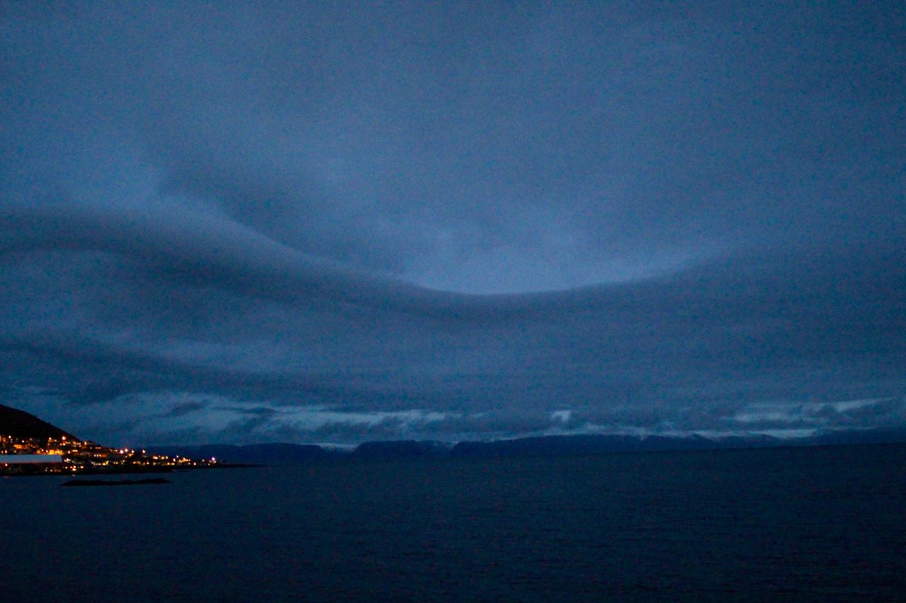 The mountains we saw when we first crossed into the Arctic have given way to lower hills and rocky barren islands. There are notably no trees now. Whilst there is vegetation plenty enough to support reindeer herds in summer, it doesn’t grow tall enough to be considered a tree. There are plenty of grasses, mosses, shrubs and ground covering though. The reindeer are herded by the nomadic Sami people indigenous to Scandinavia. They take them further inland towards the colder climates for winter. This seems strange, however it is due to the conditions here in winter being too icy. Because of the Gulf Stream it only gets to a balmy average of about -4 over winter. What this means is that the snow that falls melts then freezes or rain hits the ground and freezes, covering everything with thick ice. Reindeer cannot break through the ice to get to their food. They are equipped however to withstand the -40 temperatures further inland and can dig down into the soft dry snow to reach the food underneath.
