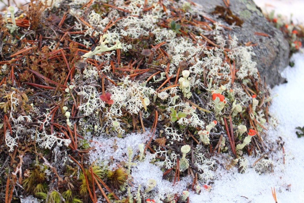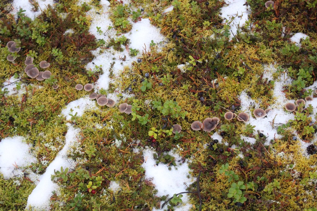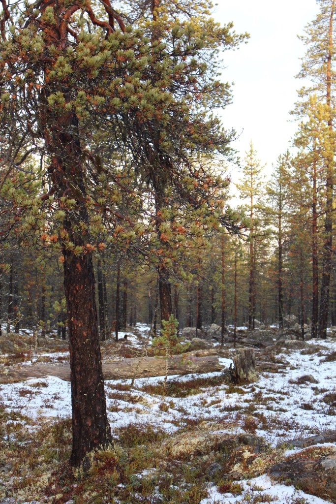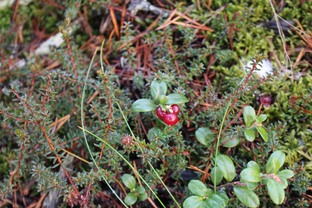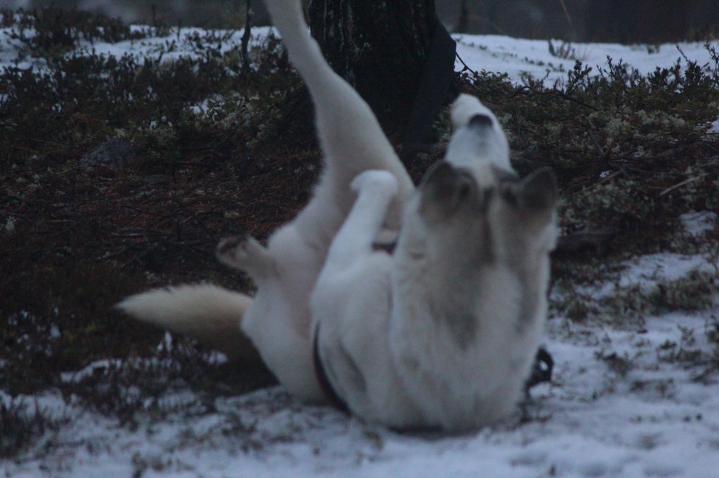 We stopped for a hot berry drink and cake and the dogs at this time were tied to trees. Uhku was sniffing around and eating something from the ground. Janne explained that these were the ‘crow berries’. Highly nutritious berries that the dogs like to eat. He was definitely a food oriented dog and I exploited this for cuddles and bonding! We also found lingon berries. Both berry varieties grow on low ground cover on the forest floor. The lingon berries were ripe and delicious. The crow berries were frozen and had lost some flavour – although we found some later that were better.