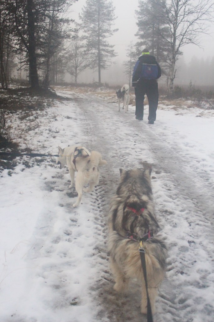 In our situation today, the dogs were taking us for a walk. They are not domesticated as such so they do not heed to a human the way a domesticated dog would. They are not expected to come, sit, etc. Janne led the direction. His personal dog was the pack leader, and it felt like we were just part of the pack. The dogs were tied by leash to our waist and would pull and tug away. If not careful they would have us on the ice and tripping and stumbling around. They stop and sniff, mark territory as and when they want, we were just tagging along for the ride.
