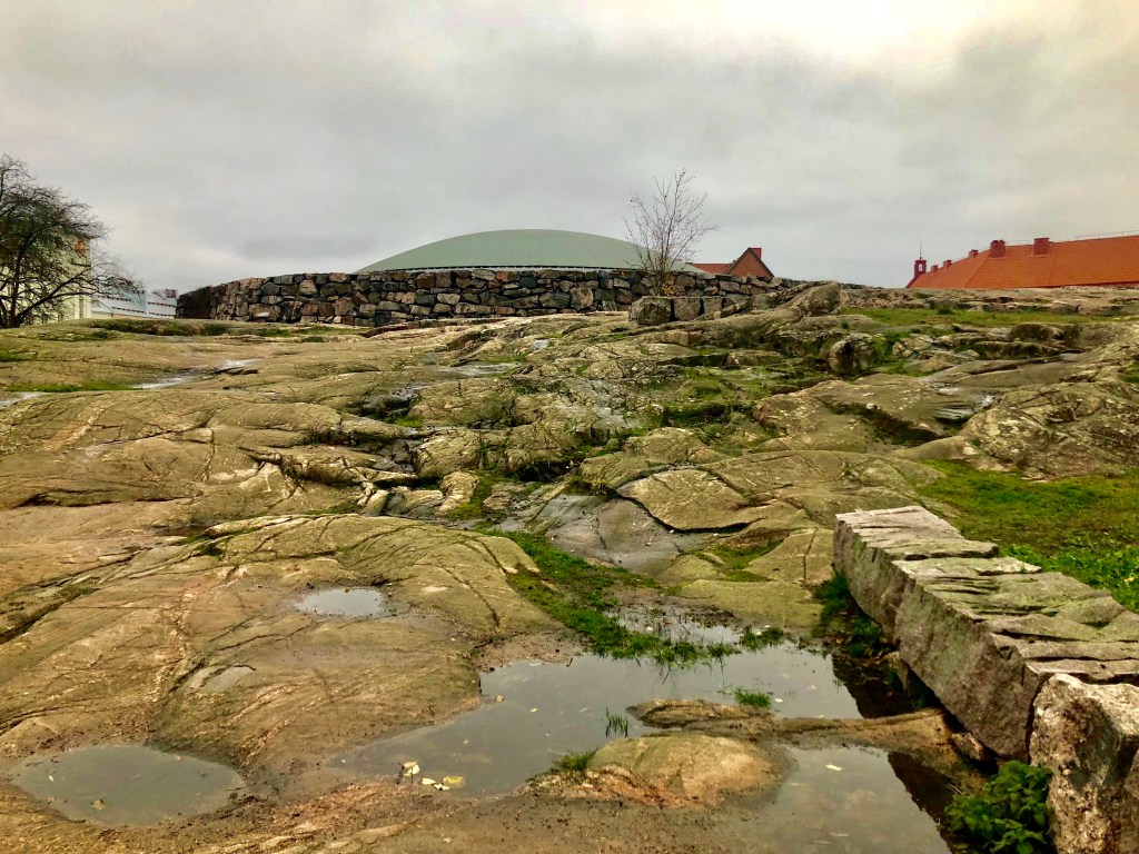 Temppeliaukio is a church hewn out of solid rock. Therefore it is also known as ‘Church of the Rock’. We circumnavigated the site before we found the main entrance. From the outside we saw a circle of stone wall with a green copper dome on top. Pretty unimpressive from the outside. We were clambering over a rocky outcrop in the middle of the suburbs that seemed incongruous with its surroundings.