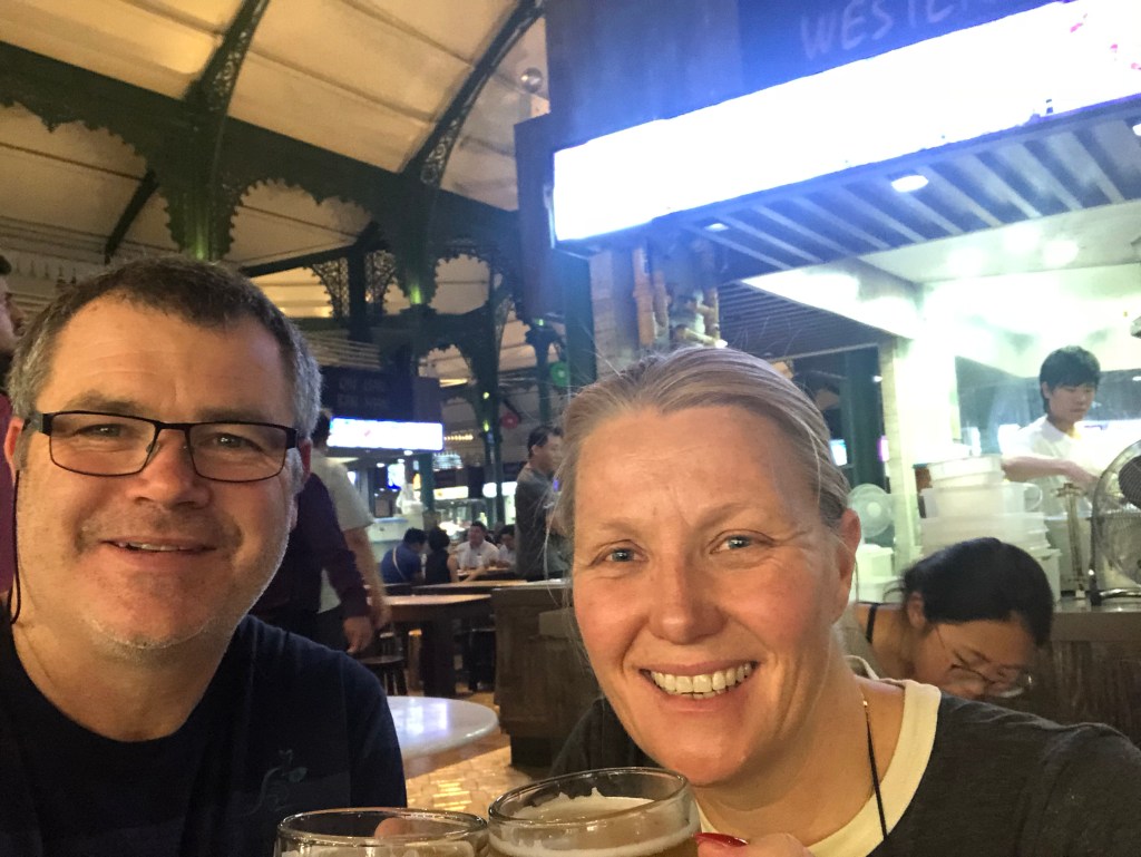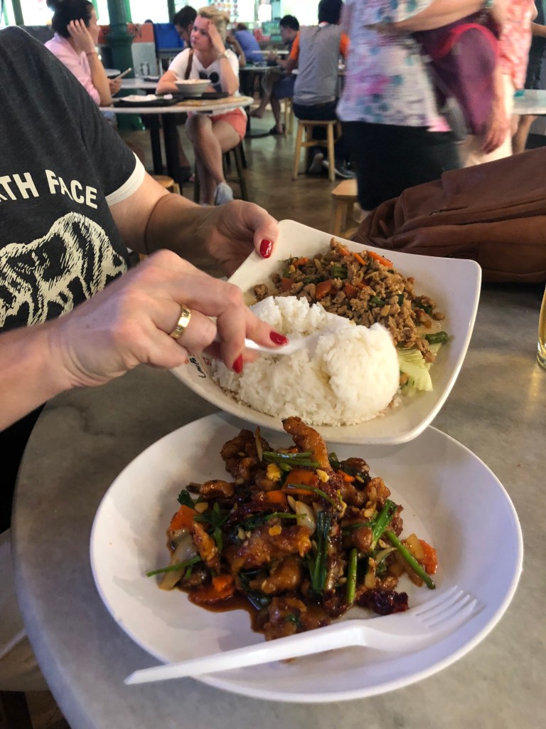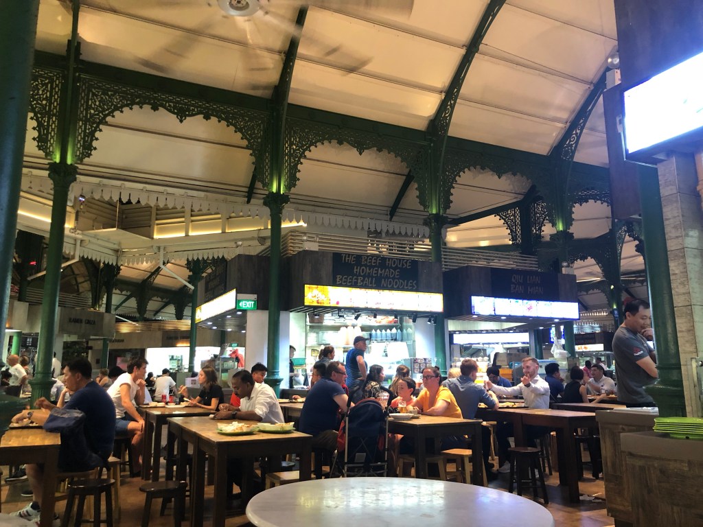 We easily found the office and then walked about 5 minutes (in what ended up being the opposite of where we intended), and luck had it we stumbled across a great ‘Hawker Food Market’. These markets are dotted around everywhere in Singapore, and perhaps they vary in quality and popularity, but it seemed we found a good one. It was really busy and vibrant. The food options were overwhelming. We walked around and around for a while before we settled on some awesome Thai food. I really don’t think we could go wrong. Andy then found the ‘Best Satay’ stretch of outlets. This was an outside area the stretched what seemed a full block of many bbq’s and kiosks all cooking up their best satay. There were hundreds of people sitting outside tucking in to plates and piles of satay prawns, chicken, beef. How could we not give it a go?!