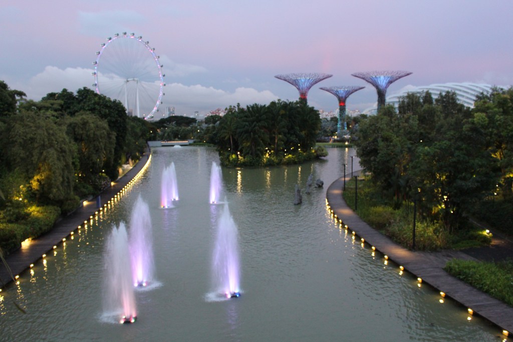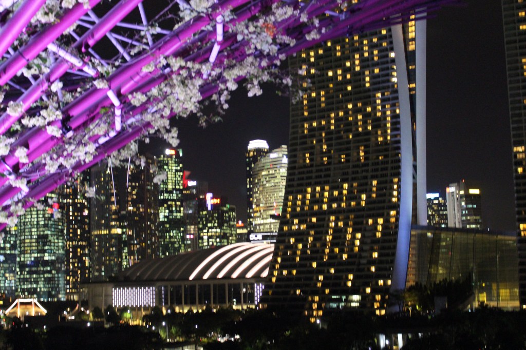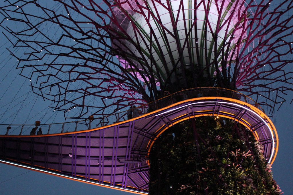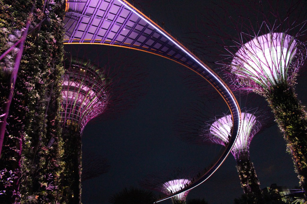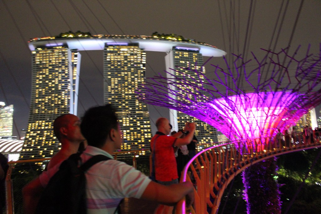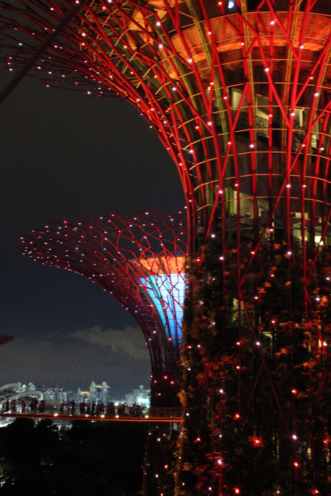 After we disembarked the cruise, we walked around to the ‘Gardens by the Bay’. Our walk took us from Raffles Quay all the way around the Marina Bay Area and into the Gardens. We arrived on Sunset and honestly I was totally ‘wowed’ by the sight. By no means did we manage to cover it all, but we did experience the fantastic light and sound show of the ‘Supertrees’. The Supertrees are vertical gardens that are so ‘other worldy’ that they simply shouldn’t be missed. We managed to time our ascent to the Sky walk with the light show. The skywalk is an $8 ticket – well worth it. Although if you are afraid of heights, probably not. The walkway is suspended from the canopy of the supertrees and is 22m high. It does sway and move slightly. There is an expected 15minute time limit, however by moving very slowly we managed to eek this out to 30mins and take in some of the light show from this perspective. The light show can be enjoyed just as much from the ground.