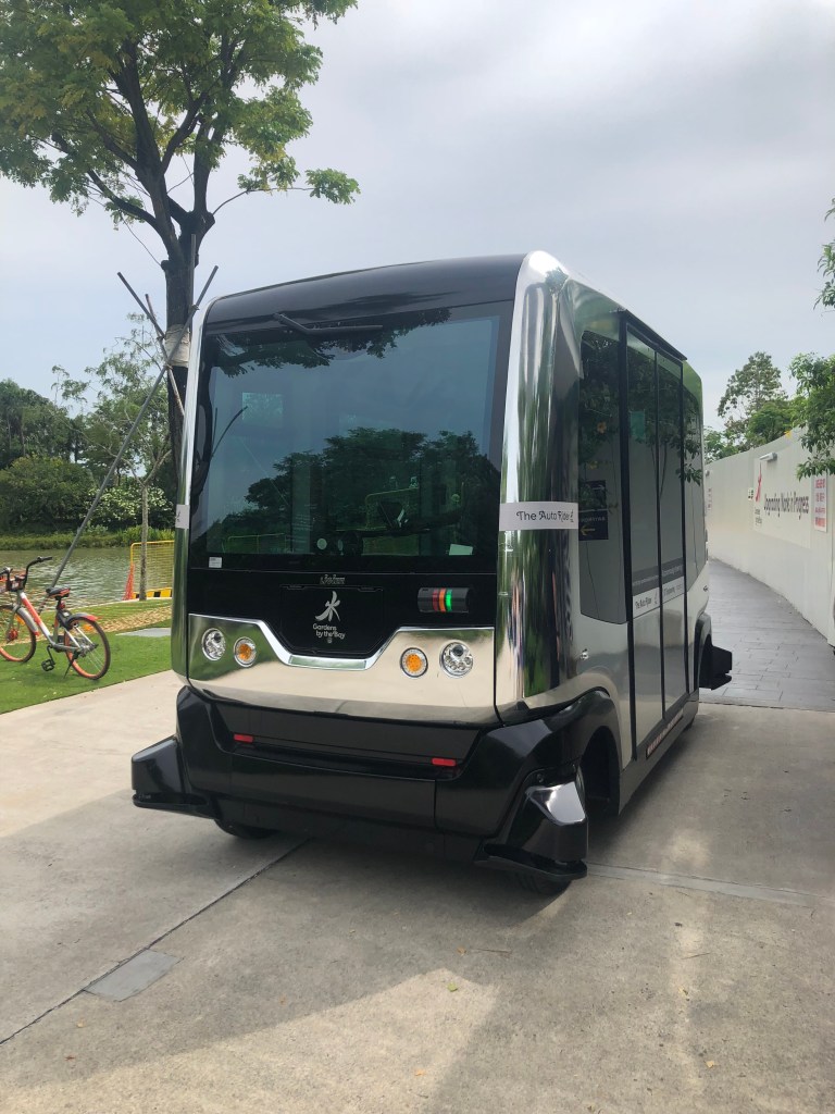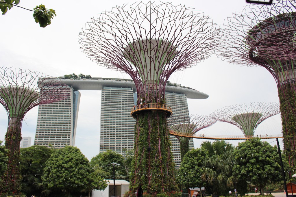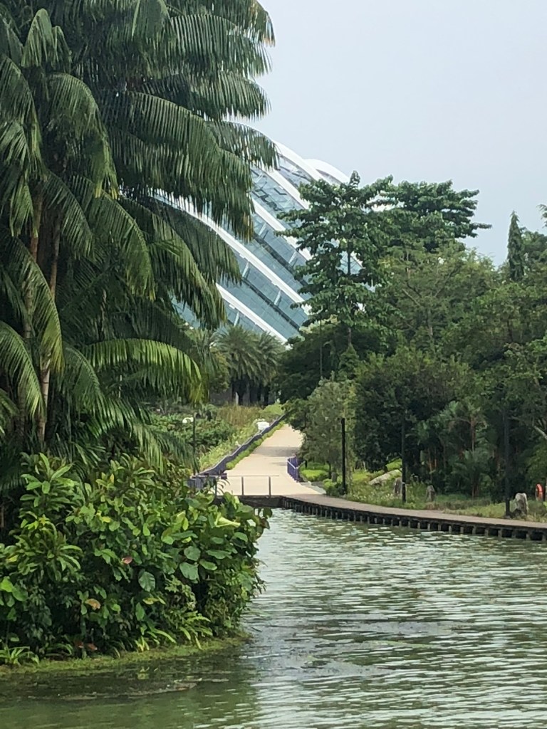 It’s very easy to get around in Singapore with walking and using the train. We’ve had no trouble at all. We found the closest MRT station to the Gardens and then followed the signs directing us to ‘Gardens by the Bay’. Once there we opted for an $8 guided tour on a trolley bus to get our bearings. So glad we did. The area of the park is 101 hectares/apt 250 acres/1km sq of reclaimed land. To walk the perimeter might be ok, but when you want to follow the paths, walk along the canal it would be all day to see it all on foot.